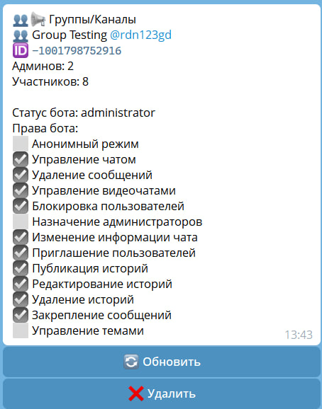 Профиль чата/канала содержит информацию о количестве админов и участников, а так же, о правах бота.