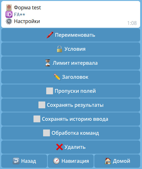 | Сохранять историю ввода | Удаление или сохранение пройденных результатов форм |