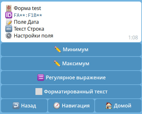 | Минимум и Максимум | Определяет количество символов которое будет принимать поле. |