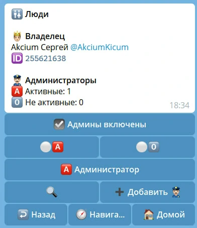| 🤴🏻 Владелец | Имеет полные права над ботом. Может назначать админов, удалять админов, удалить бота. |