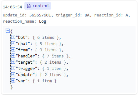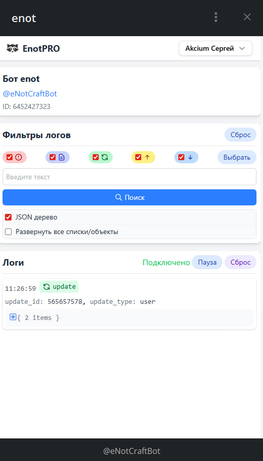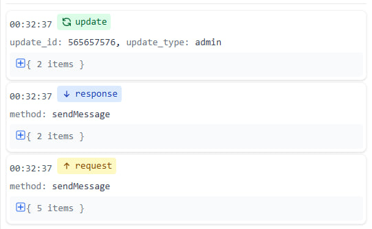 Логи — это окно во внутреннюю работу вашего бота. Здесь отображаются все данные, которые бот получает от Telegram и отправляет обратно, в исходном, необработанном виде.